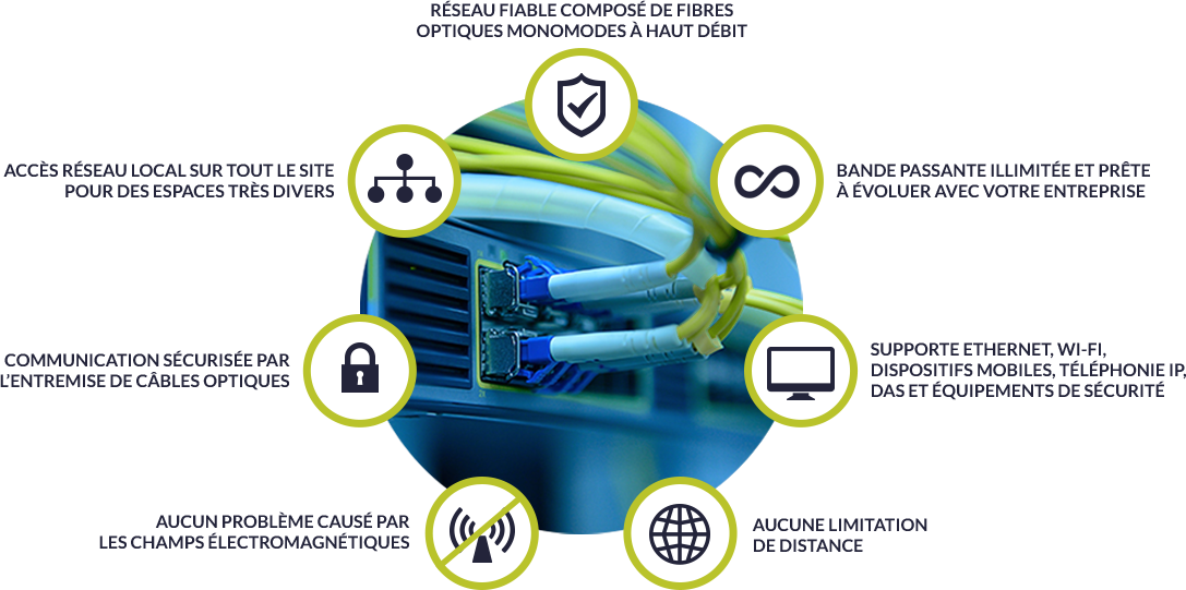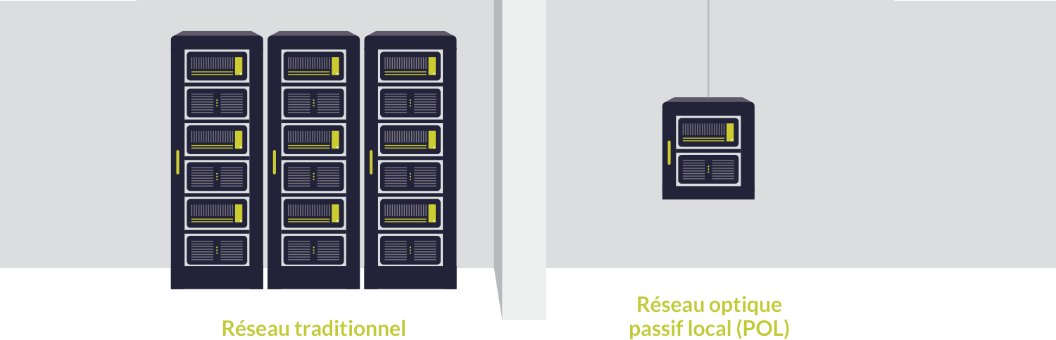 Un réseau optique passif local (POL) remplace le câblage en cuivre traditionnel par de la fibre optique monomode.