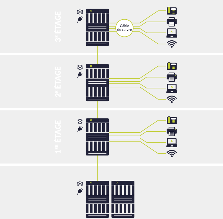 Un réseau optique passif local vous permet de remplacer les répartiteurs intermédiaires « IDF » actifs par des composants passifs, réduisant par le fait même les besoins d’espace plancher, d’énergie, de climatisation et les coûts d’installation.