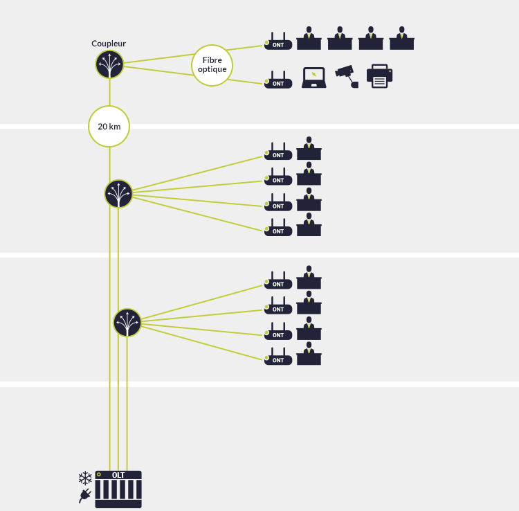 Une même fibre peut être partagée par plusieurs usagers. Le raccordement final est identique : chaque foyer ou poste de travail possède sa propre fibre. Entre l’utilisateur et le nœud de raccordement, l’utilisation de coupleurs dans le réseau permet de partager l’information transitant dans une fibre entre 64 ou 128 utilisateurs. Ceux-ci reçoivent un même signal lumineux. Les données sont donc chiffrées en amont puis « séparées » par l’équipement final du client (par l’ont).